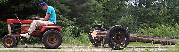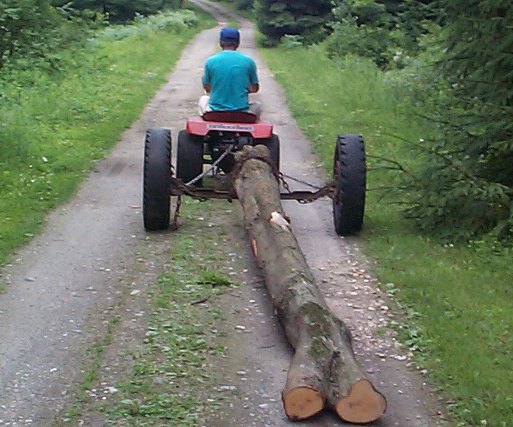 Chains are wrapped around the log and pass through two conveniently located triangular openings in the axle assembly (where the control arms are welded to the main axle body to keep the wheels aligned). The chain ends are then fixed to the tractor so the pulling force also securely clamps the log to the axle.