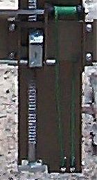 This view shows the mechanisms of the Logosol M7 sawmill. The chainsaw is drawn down the guide rail and through the log by reeling in the white nylon cord. At the far end the cord is attached to the guard which is clamped to the rail and has teeth ("dogs") that grip the end of the log. The log is sitting on two log beds that are raised and lowered by turning the crank to reel in or play out the heavy green cords. At the base of the vertical stainless steel bar on the logbed is a set nuts and bolts that allow the log beds to be fine tuned to each other. The bar has teeth that engage a pawl which has two sets of teeth, coarse and fine. Seen below and left of the cord spool, the pawl ratchets into position on the bar with an audible click; the coarse side of the pawl raises the bed in 1/4" intervals, and the fine side raises in 1/8" intervals. The guide rail is two sections totaling slightly over 16 feet long, short extensions are available as well as half mills which add 8+ feet and another logbed. |