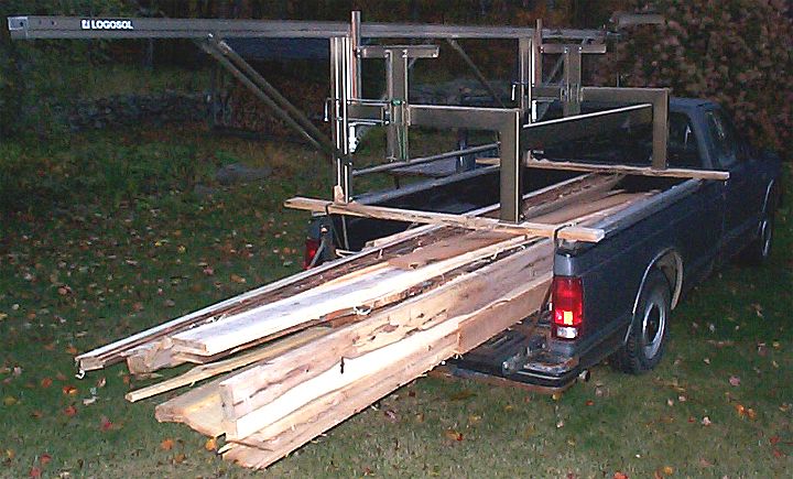 The M7 sits nicely on the rails of my S10 longbed with room below for the saw, accessories and a load of select hardwoods for the growing piles.