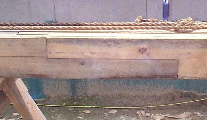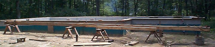 Now that the scarf is pulled tightly together I layout the remaining joinery and locate holes to recieve the J bolts set in the foundation. The clamp at the far left end of the combined timber is holding one of my 100ft. tape measures in place, it's identical twin is layed out on the foundation.