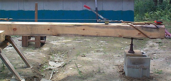 Approaching the moment of truth, this is the initial test fit. The timbers are fairly closely aligned and roughly 1.5" of tenon is being laid into the mortice by slowly lowering it with a jack. Getting to this point was the most tedious part of the entire process. I'm a couple of saw horses and one block column short of what I could really use and as you can see in the pictures below some of the terrain has become a challenge to cross over.