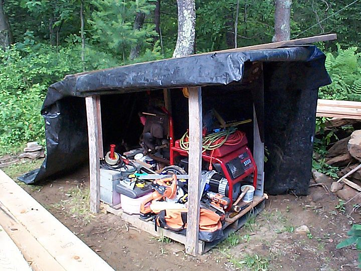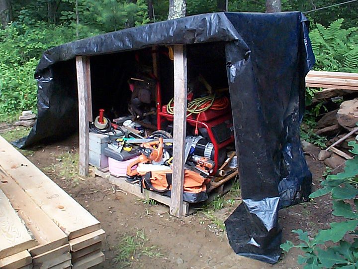 The "Generator Shed" is a pallet, four "snakewood" 2x4 posts (shorter posts in the back; the front faces to the right), two 2x3 rafters (running front to back) and the remains of the 1/2" plywood my column forms were cut from. Two rectangles of black plastic are attached to the roof so that 1-4 sides can be opened completely. In addition to the generator the shed houses most of the tools that get left on site.
