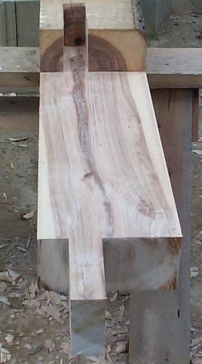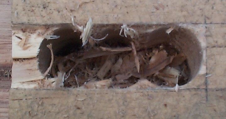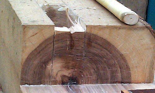Here you see my solution to a bit tracking problem; the problem was the lead screw on the bit kept slipping sideways into a crack that has developed in the timber. The bit is exactly 2" wide so it's most important that it starts perfectly centered in this 2" mortice. I sawed down the sides of the mortise and pared out material to a point where the crack was nearest the center and the sides lock the bit into proper alignment.