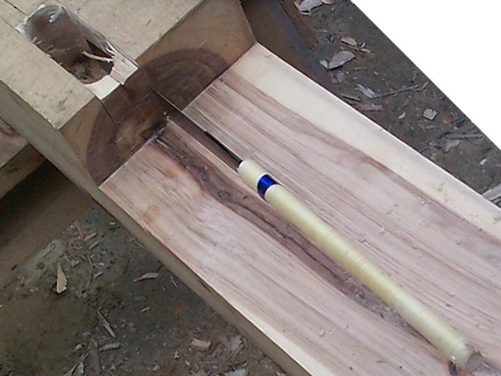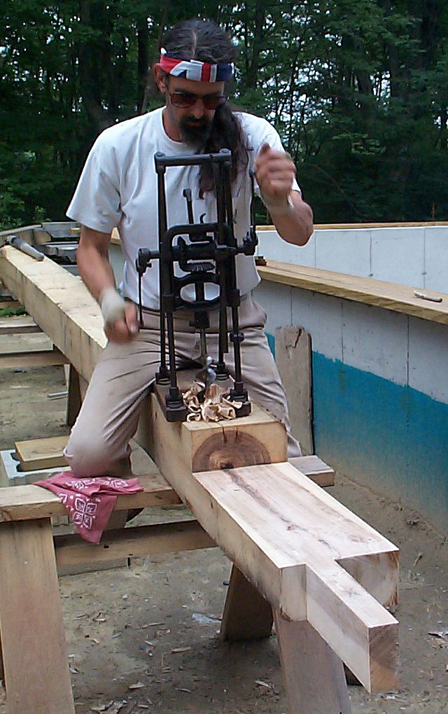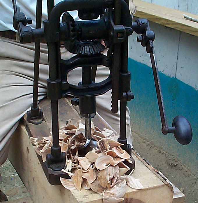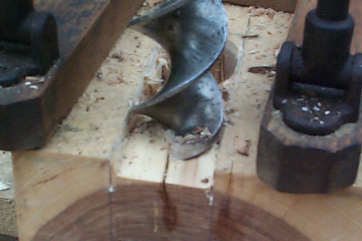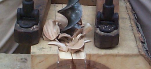 After laying out and scoring the lines for my mortice, I carefully selected my sharpest 2" bit and mounted it on my trusty Millers Falls boring machine. This was my first experiance boring into hickory as well as the first time using a 2" bit on a hardwood. The bit performed remarkably well, I'd have to say that this bit cut through 4" of hickory faster than my 1-1/2" bit cut through 3" of maple (did I tell you what the sharpening guy did to my 1-1/2"bit? ... I will).